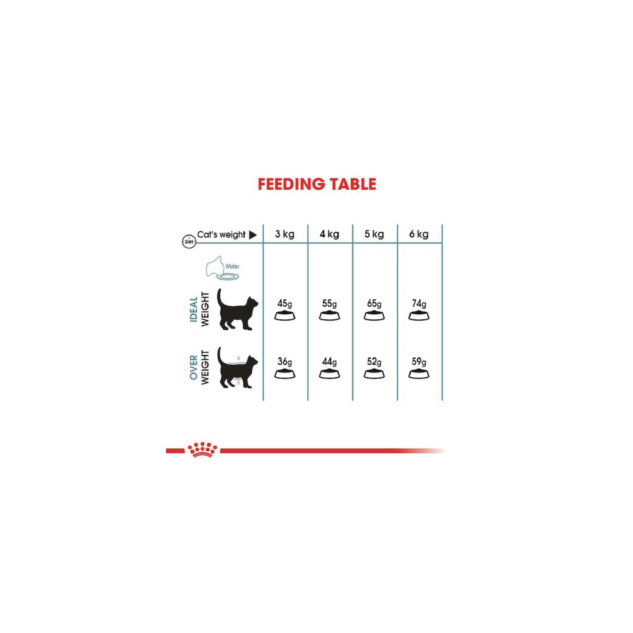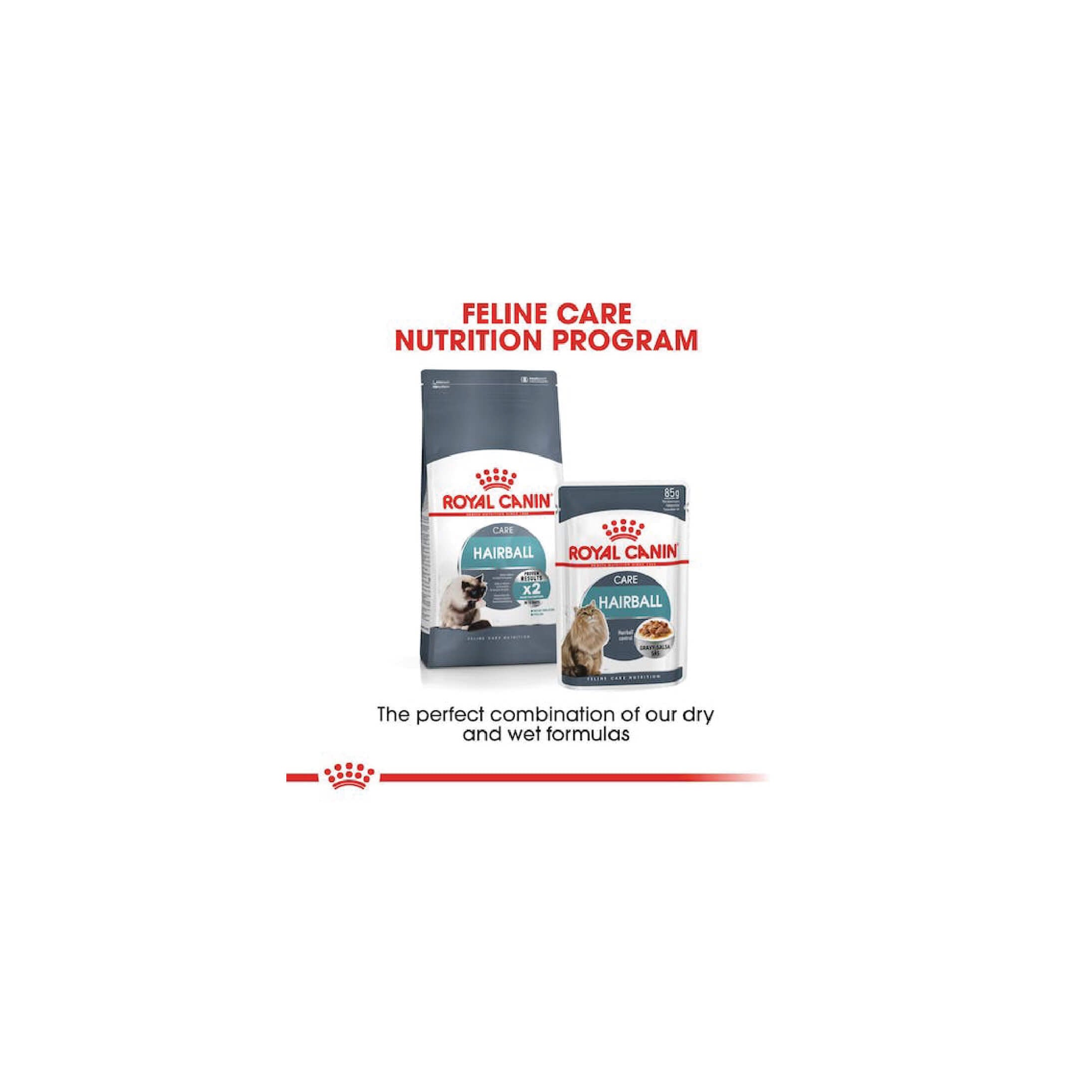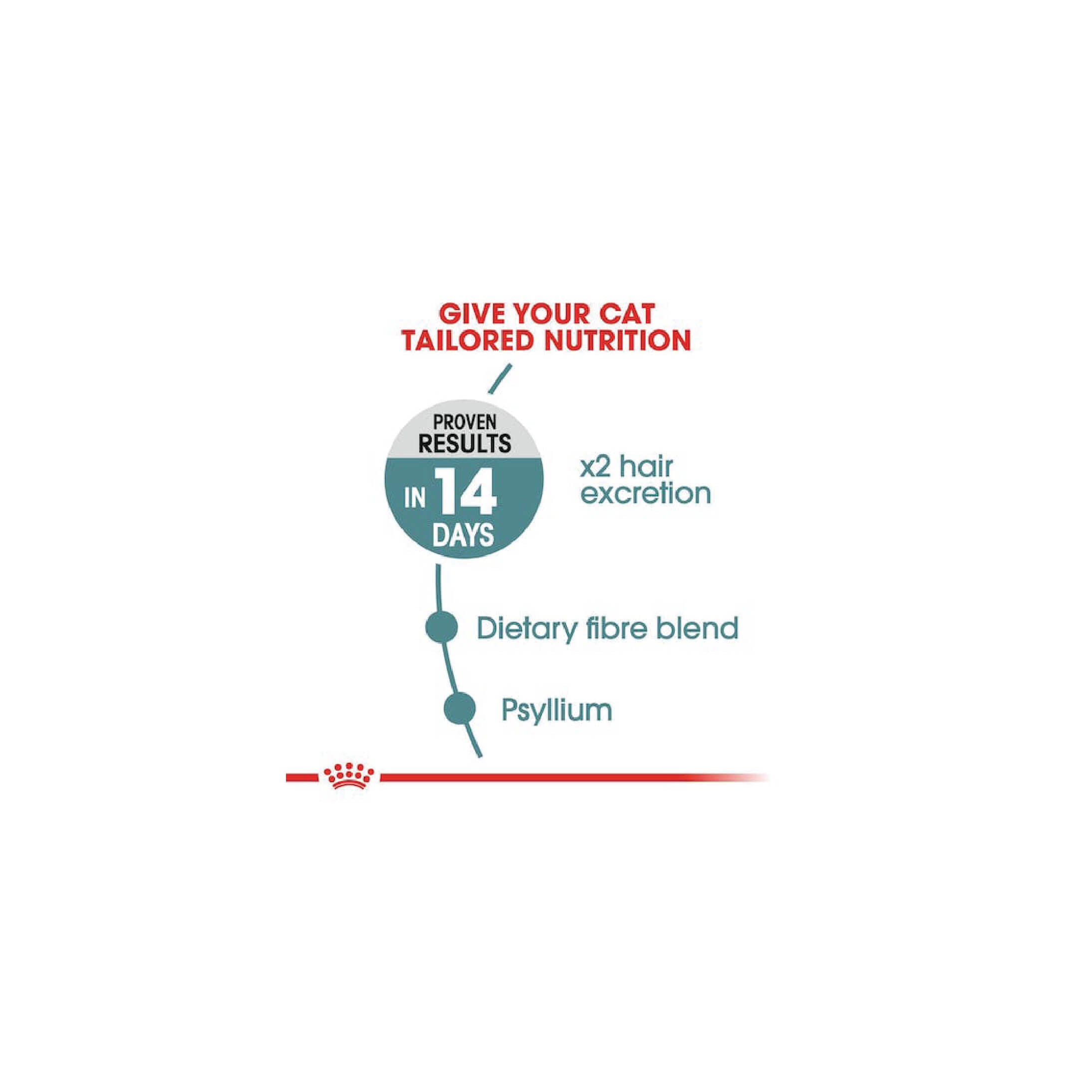 Cats often spend large parts of its day self-grooming, and can therefore swallow large quantities of hair. This ingested hair can become compacted in the digestive tract, resulting in the formation of hairballs which are then either regurgitated or eliminated through its faeces.ROYAL CANIN® Hairball Care is composed of a specific blend of dietary fibres, including psyllium (rich in mucilage) and insoluble fibres to help naturally stimulate healthy intestinal transit. As a result, hair swallowed daily can be eliminated in its faeces rather than building up in the stomach and being regurgitated.ROYAL CANIN® Hairball Care contains a precise combination of nutrients with a high protein content (34%) and a high fat content (15%) to ensure that a healthy level of nutrients is maintained effectively.ROYAL CANIN® Hairball Care has been proven to eliminate twice as much excess hair in a cat's body after just 14 days of feeding.To cater to each cat's individual preferences, ROYAL CANIN® Hairball Care is also available as wet food in delicious gravy. If you're considering mixed feeding, simply follow our feeding guidelines to ensure your cat gets an accurate amount of both wet and dry food for optimal benefit.