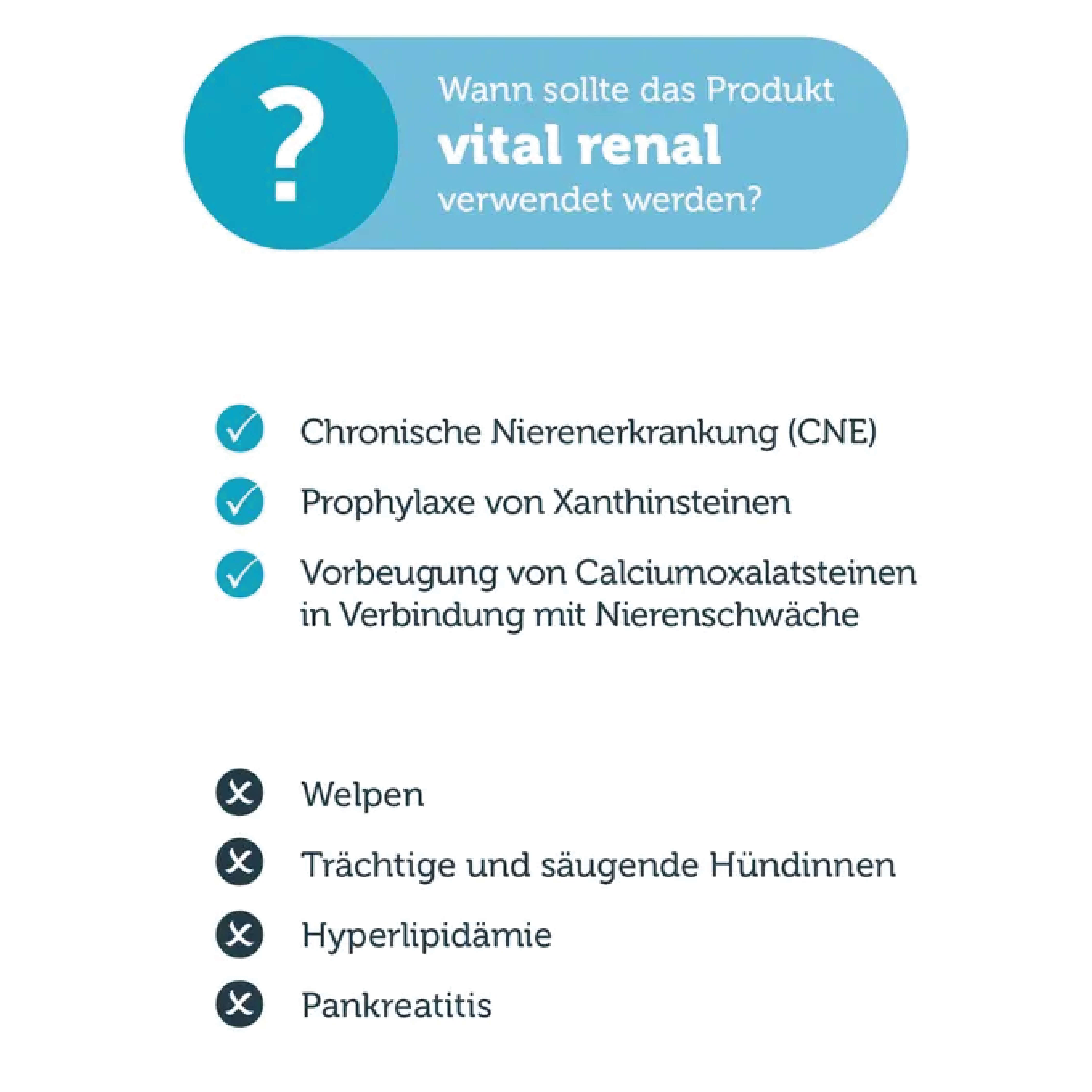 To ease the burden on digestion, it is advisable to divide the daily feeding amount into several small rations. The recommended feeding period initially extends over a period of up to 6 months. It is recommended that you seek the advice of a veterinarian before use or before extending the feeding period. If chronic kidney failure is present, feeding vital kidney or a kidney diet is necessary for life. A kidney diet started early prolongs your dog's life and, above all, the quality of life. If your dog has no appetite, you can start the treatment by feeding him vital renal wet food, which you can heat slightly in a water bath. The smell of warmed wet food often whets the appetite of sick dogs. Do not feed any other dog food or treats during treatment with vital renal, otherwise the success of the treatment will be jeopardized.