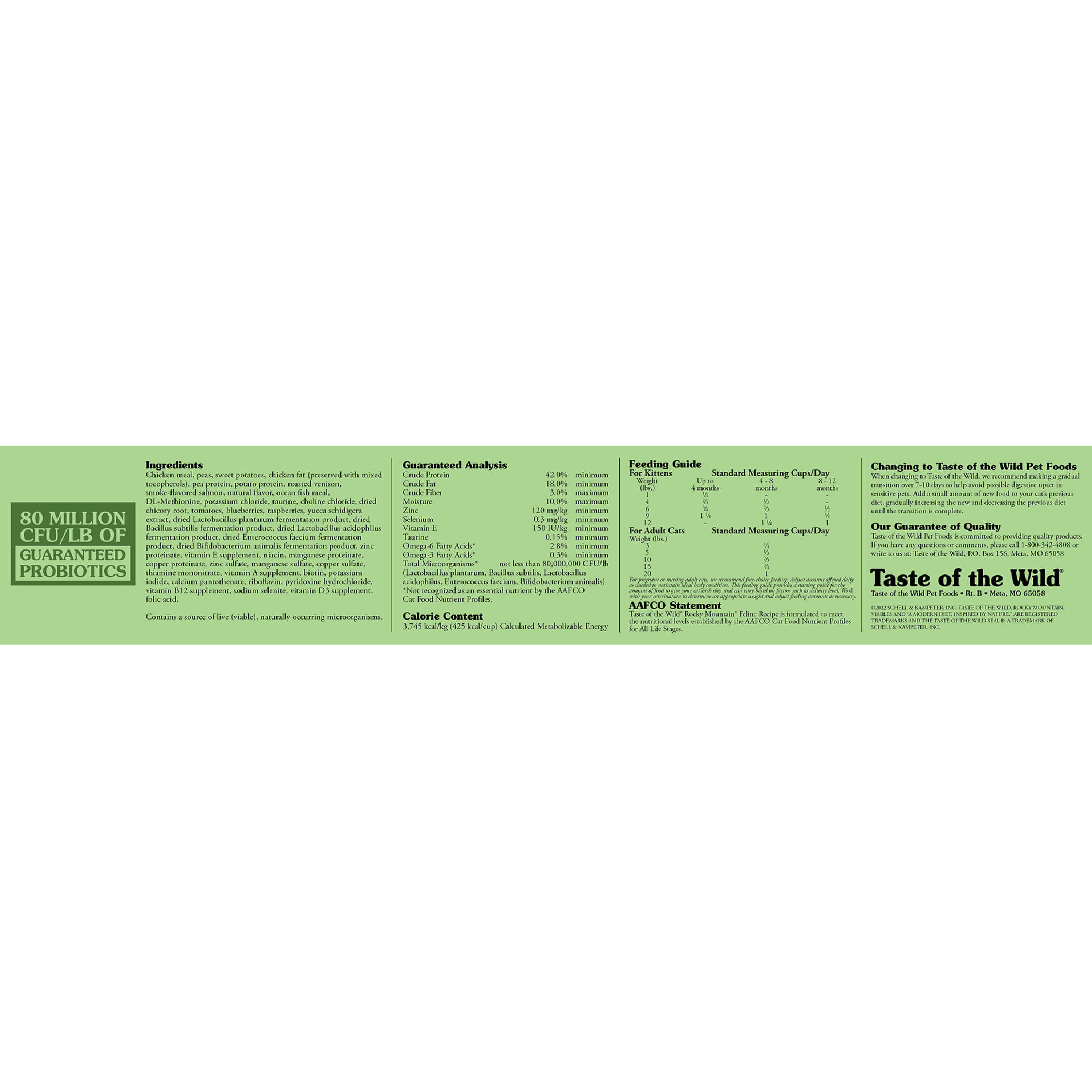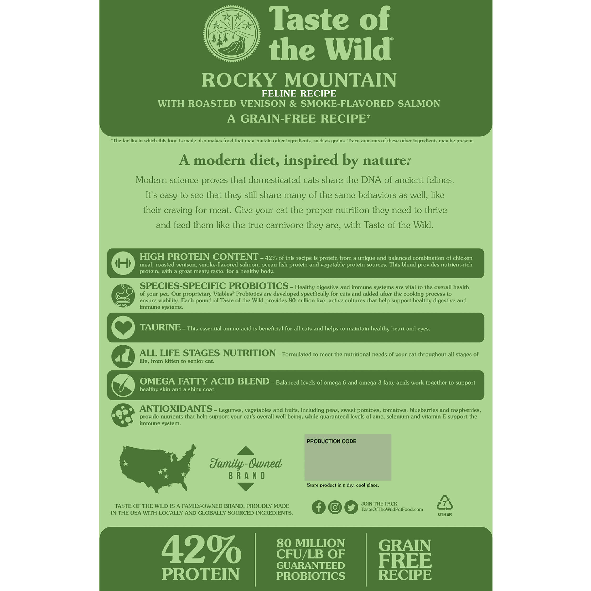 Taste of the Wild Rocky Mountain Feline Recipe is formulated to meet the nutritional levels established by the AAFCO Cat Food Nutrient Profiles for All Life Stages.